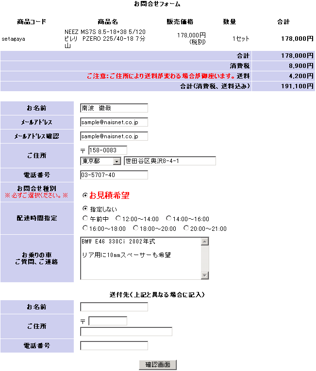 | 送料(※通信販売時のみ)を含めての再計算された見積が表示されますので、ご確認下さい。 お名前、メールアドレス、ご住所、電話番号、お乗りの車、ご質問、ご希望をご入力後、 画面下部のを押してください。 |